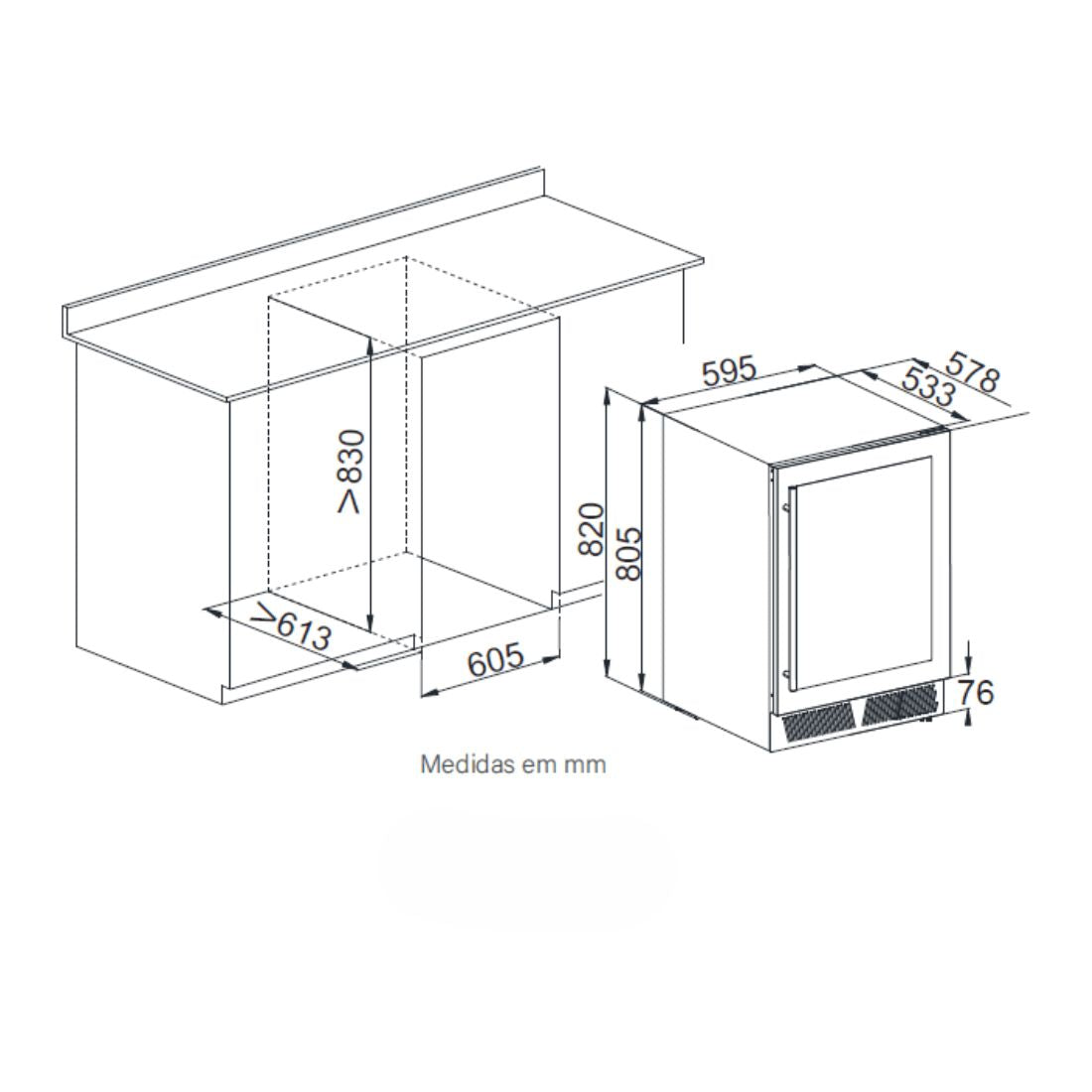 Adega com capacidade para 18 garrafas padrão bordalesa e cervejeira de 58 Litros para 36 Long Neck ou 57 latinhas de 355 ml.