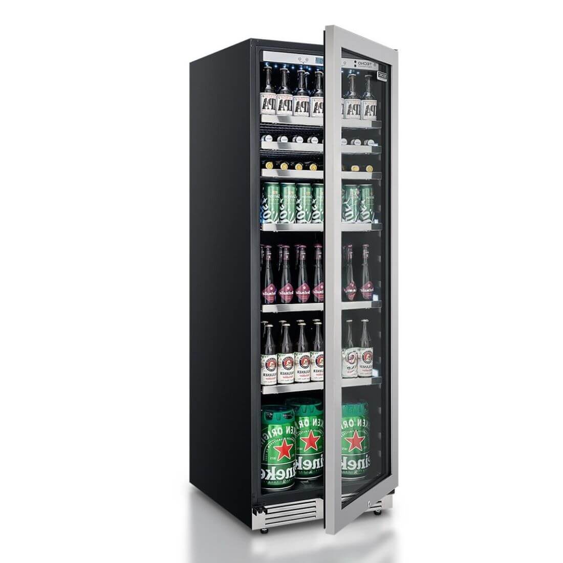 - As 7 prateleiras em aço com molduras frontais em aço escovado tem alturas reguláveis para acomodar garrafas e latas de todos os tamanhos e também barris de 5 litros.