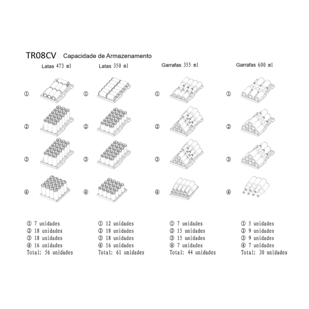 - Possui três prateleiras em aço com molduras em inox escovado, alturas reguláveis e ampla capacidade para 61 latas de 355 ml ou 44 garrafas de 600 ml.