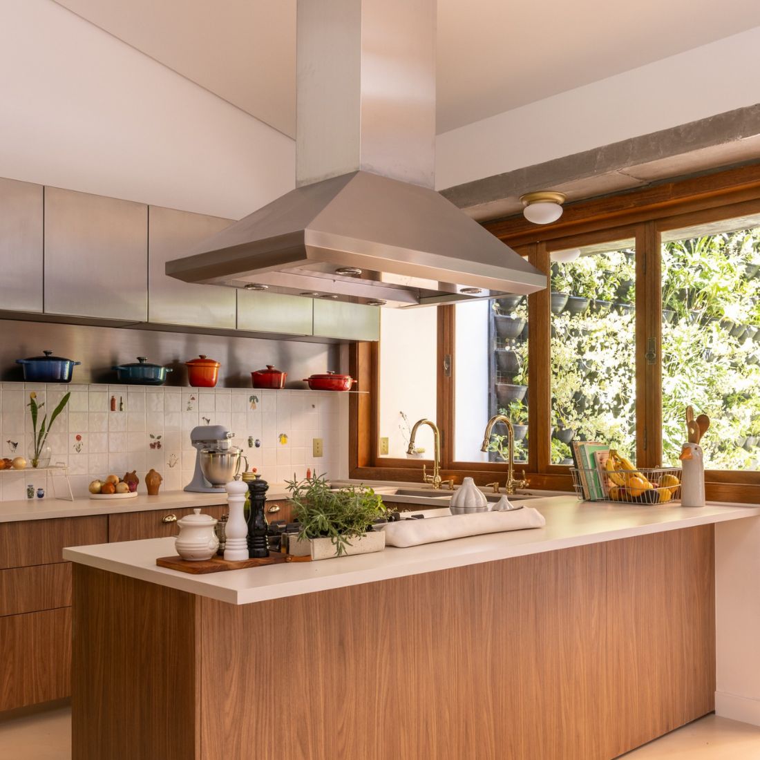 Bordas angulares com eficiente remoção de gorduras e odores.Projetada para ser instalada na ilha, com sistemas de segurança.