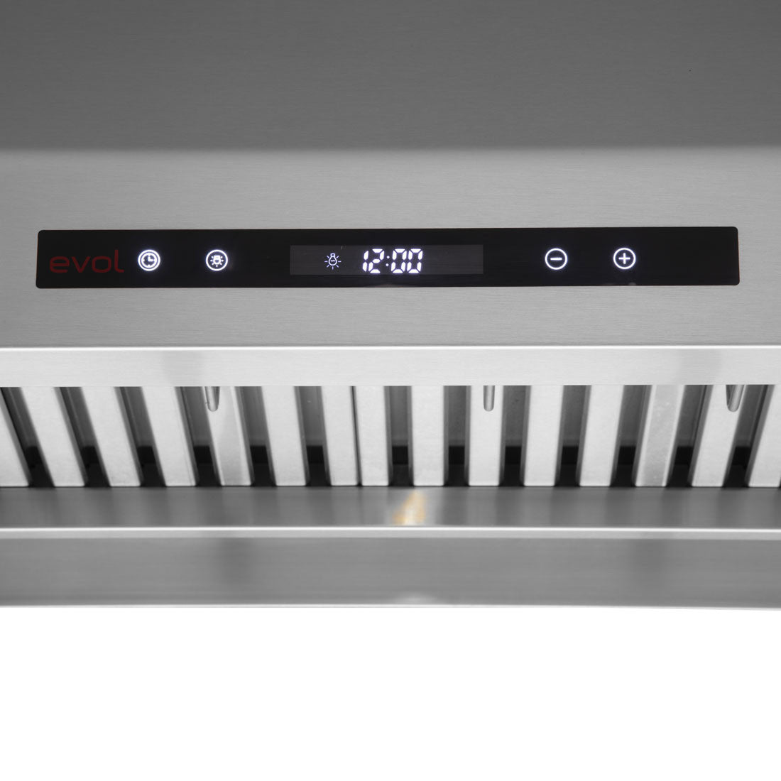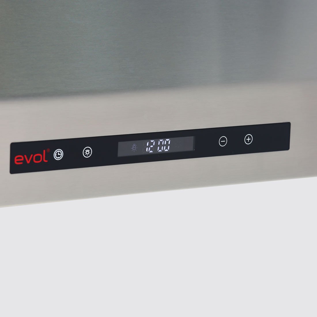- Sofisticado e intuitivo, comando touch da Coifa Alpha da Evol permite o controle fácil de todas as funções do equipamento como velocidade e iluminação.