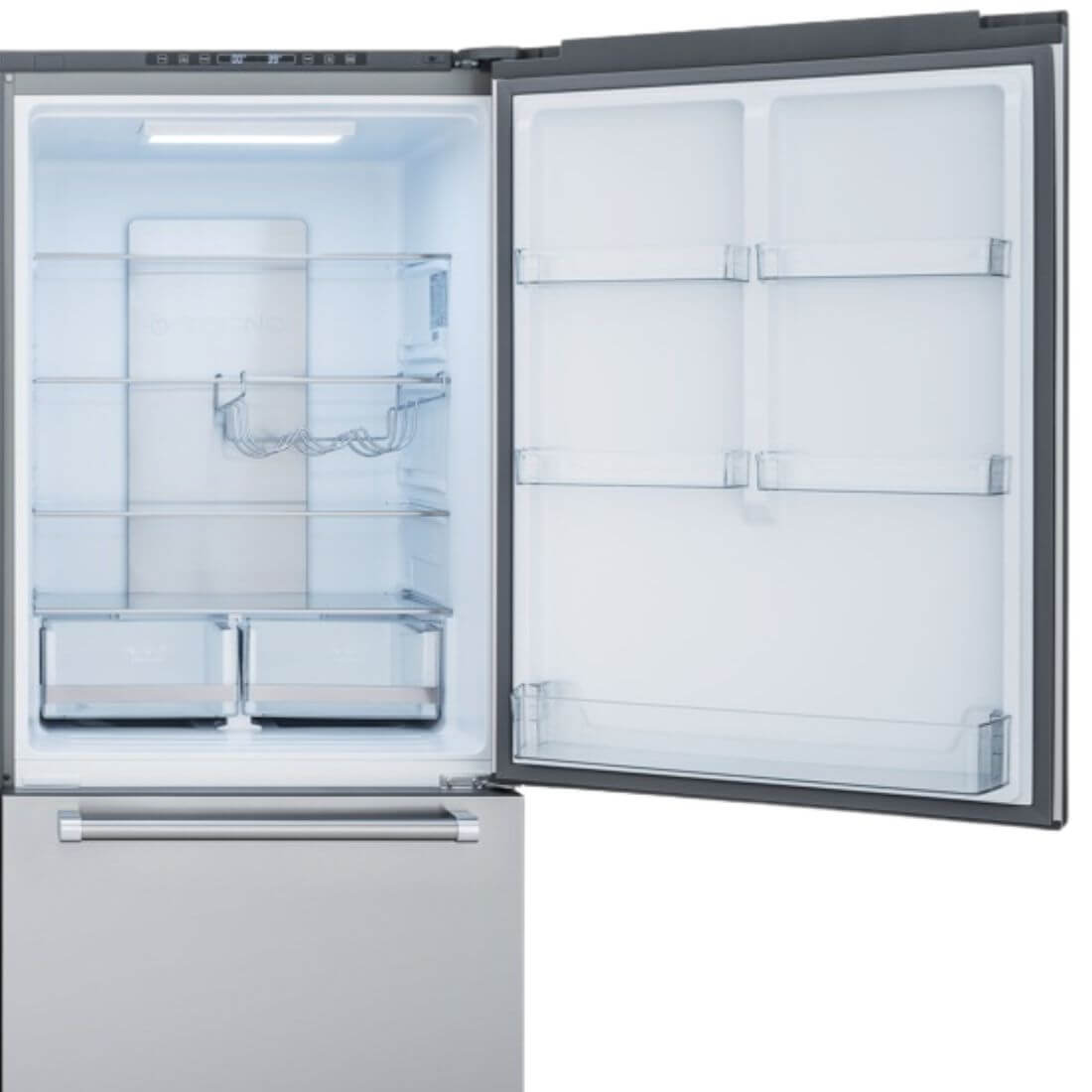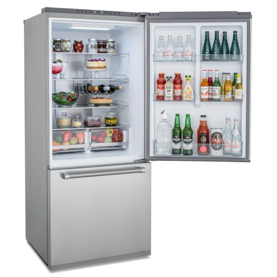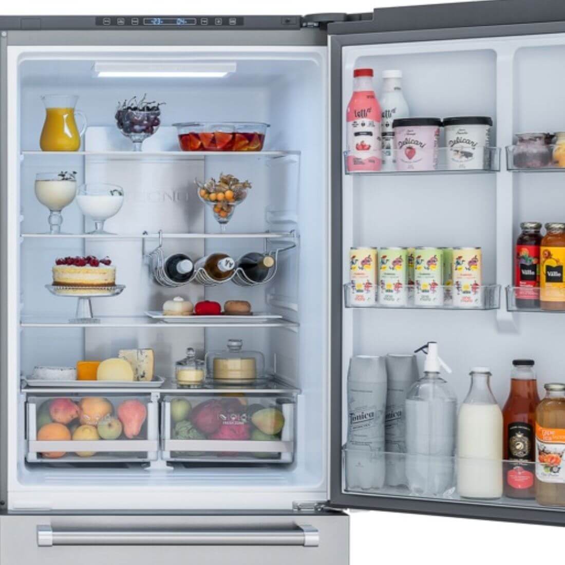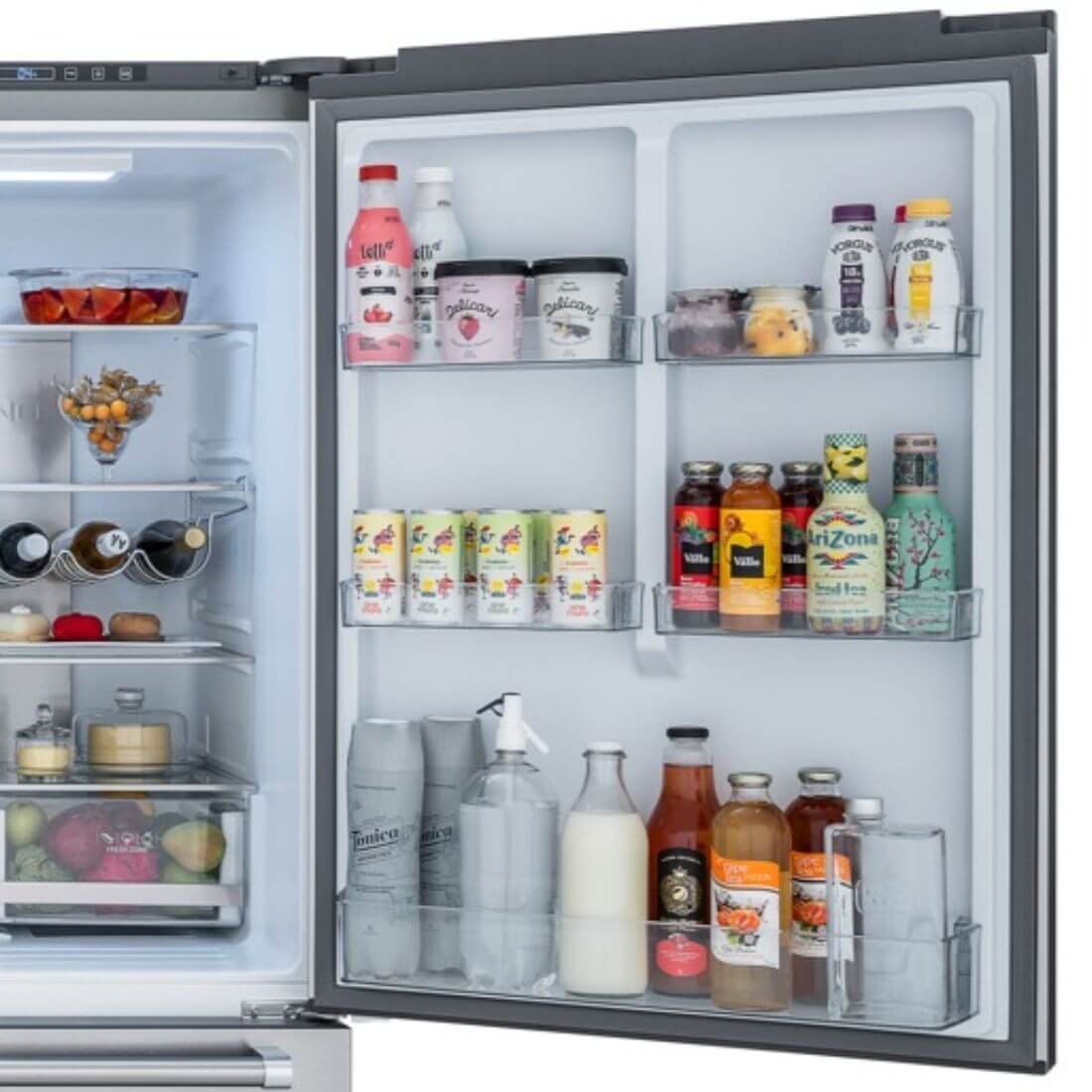 - Em suas portas estão disponíveis amplas prateleiras para acomodar facilmente grandes e numerosos recipientes de bebidas e molhos.